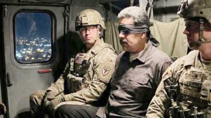 মাদুরোর হাতে হাতকড়া ও চোখে কাপড় বাঁধা অবস্থায় একটি মার্কিন যুদ্ধজাহাজে বসে থাকা ছবি সংগৃৃহীত