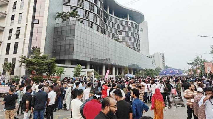 প্রতিষ্ঠানটির এক কর্মকর্তা বলেন, ‘হঠাৎ করে ভাঙচুর শুরু হয়েছে। রাস্তা থেকে কয়েকশ বিক্ষোভকারী অবস্থান নিয়ে ভবনে ইটপাটকেল ছুড়ছে। এতে ভবনের বিভিন্ন কাঁচ ভেঙে গেছে। ছুটি হওয়ার পরেও আমরা কেউ বের হতে পারছি না।’